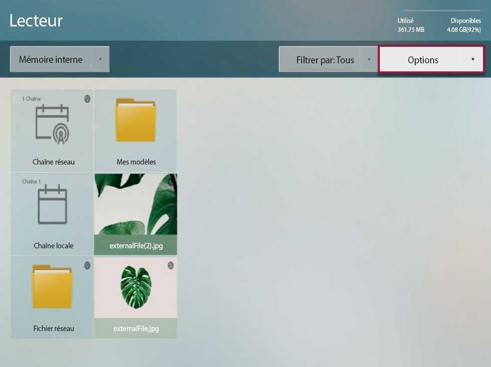 • External memory: You can play the contents that are saved in external memory such as USB storage device.