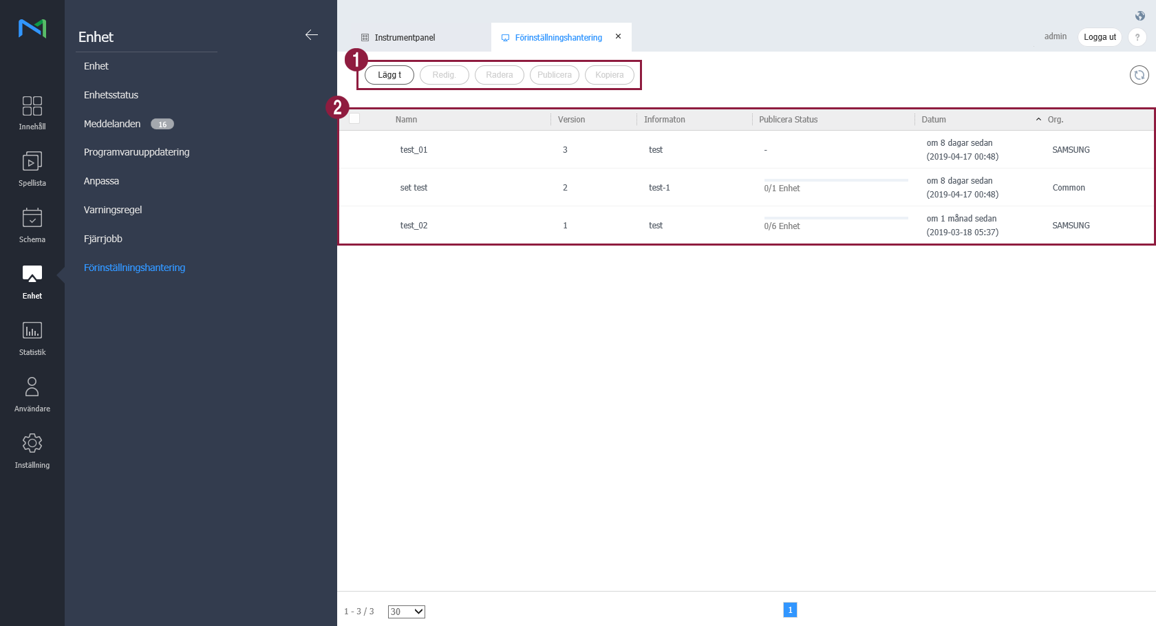 You can add, edit, delete, publish and copy presets, and view details of the registered presetsDu kan lägga till , redigera, ta bort publicera och kopiera förinställningar och visa information om de registrerade förinställningarna.