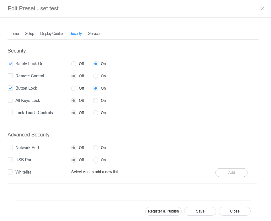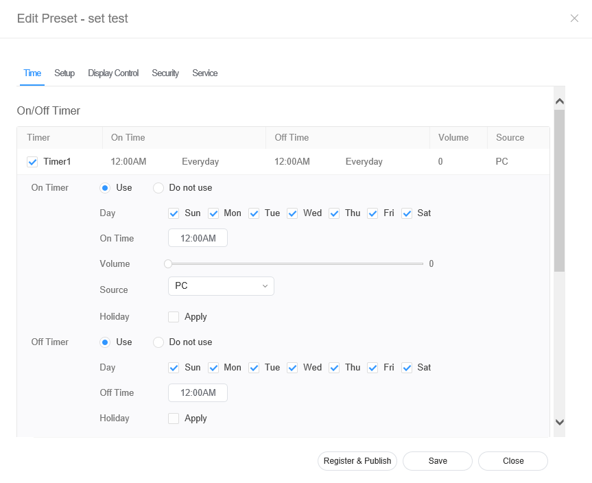 | Off Timer | Set the time to automatically turn off the device. To use the timer, select Use.