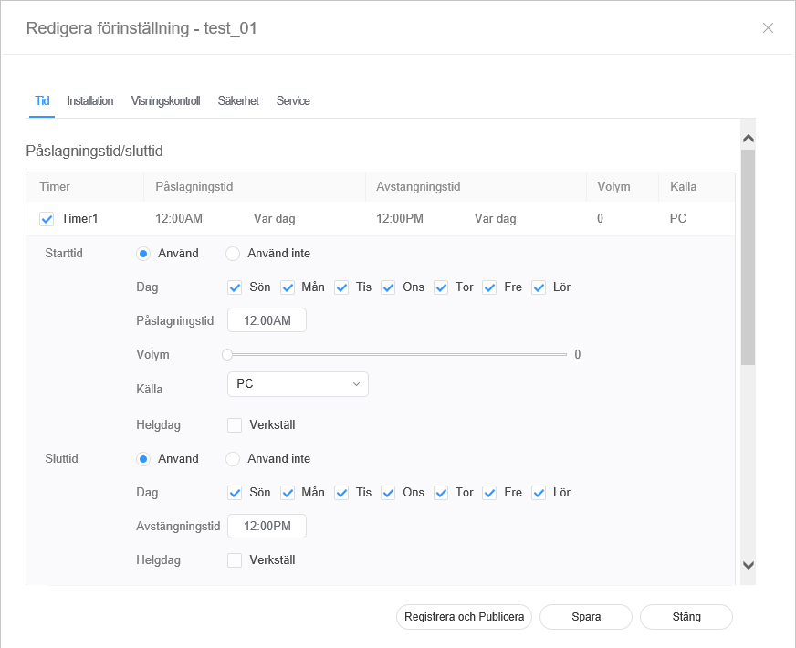 • Påslagningstid: Ange vilken tid enheten ska slås på.
