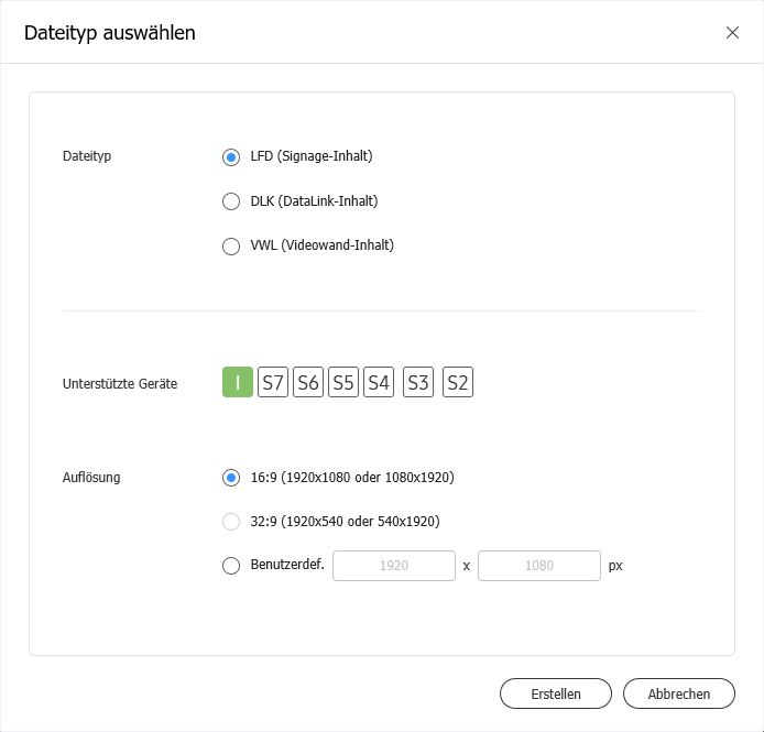 Wenn Web Author gestartet wird, stellen Sie den Dateityp, Unterstützte Geräte und Auflösung ein..