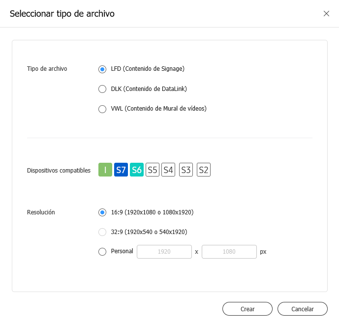 Si el tipo de dispositivo archivo se establece en MuralVídeosmural de vídeos, se debe seleccionar un grupo, registrado en el servidor, que tenga propiedades de mural de vídeos.