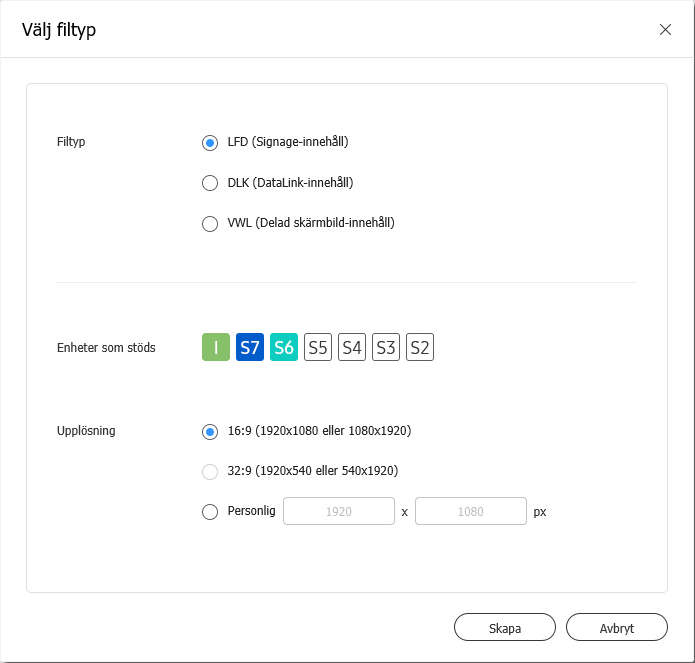 När Web Author har startats anger du typ av enhetfiltyp, enheter som stöds och upplösning.