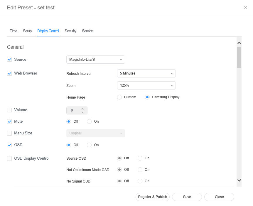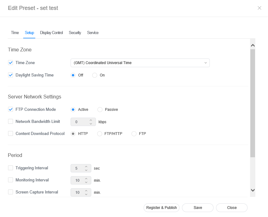 Configure the time and click Save. Click Register & Publish to immediately apply the set value to a group.