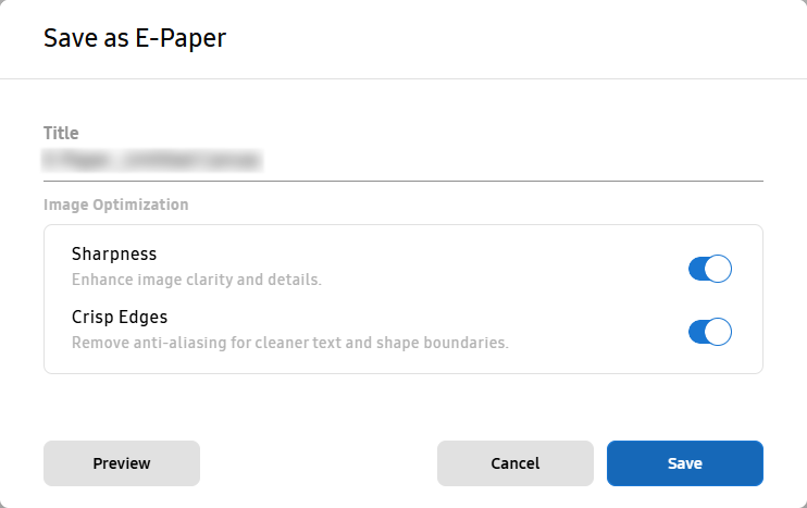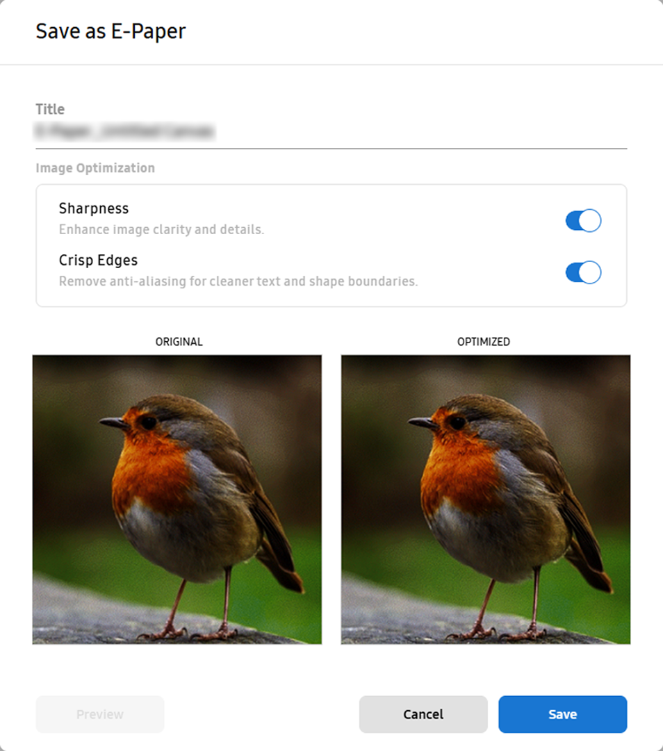 In the Save as E-Paper window, select the desired image optimization option. To compare the optimized version and the regular version, click Preview.
