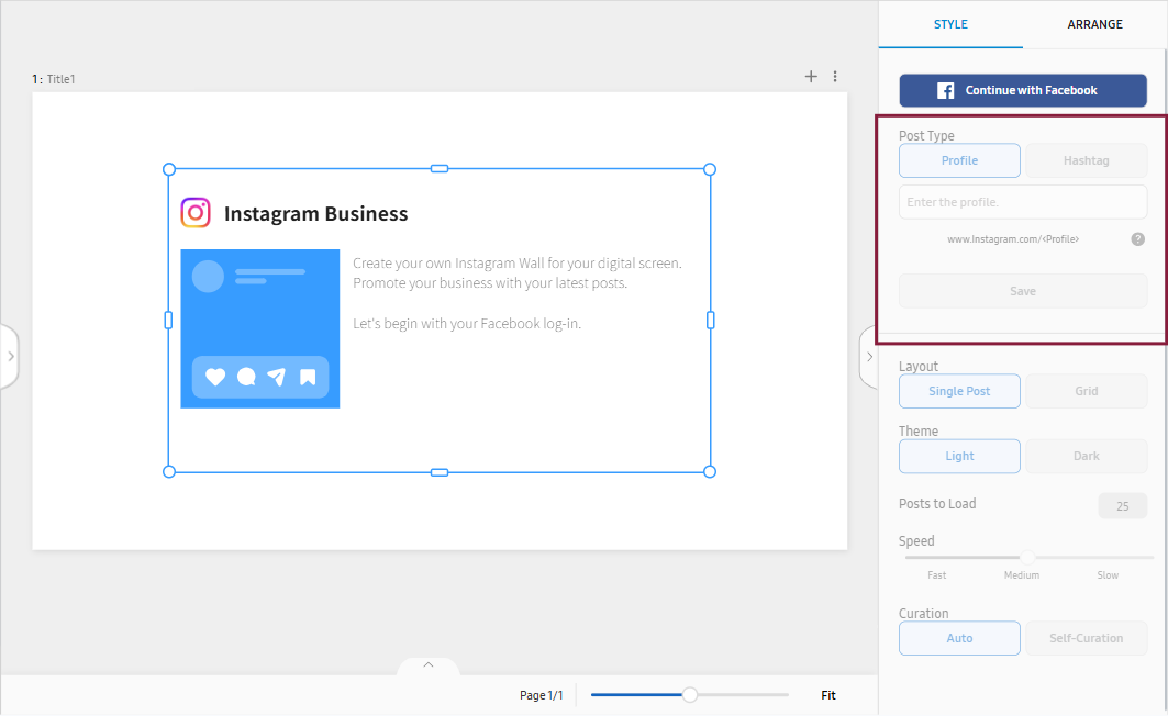 For example, if you set Speed to 10, each Instagram post is displayed for 10 seconds