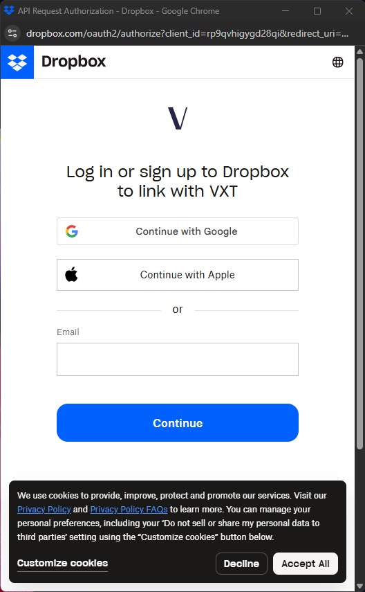 If there aren't any Dropbox accounts that are already logged in, please input the credentials of your Dropbox account, or log in using your Google or Apple account that is connected to Dropbox.