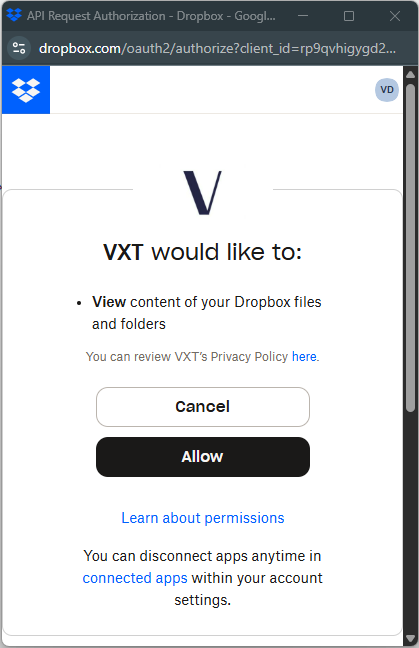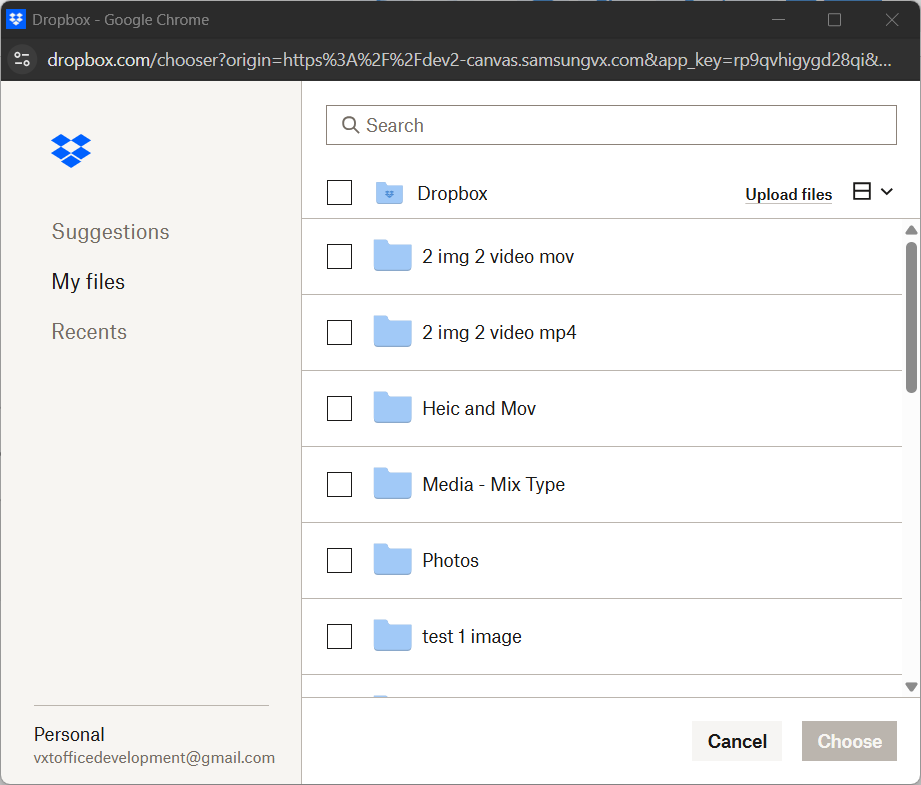 The Samsung VXT Canvas app has been connected to your Dropbox account.