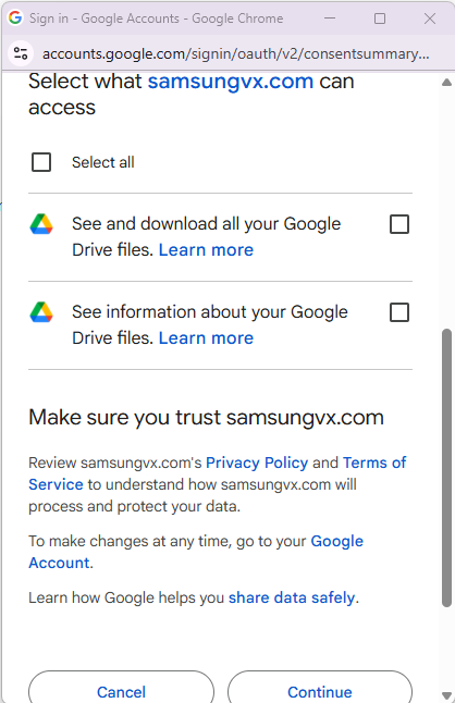 To use the Samsung VXT Canvas app with your logged-in Google account, click the Continue button.