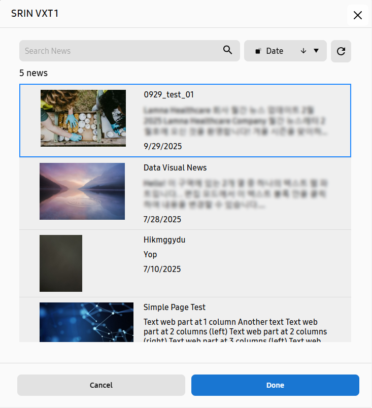 Self-Curation: Display only a news post selected by the user. The UI page to select the news post to be displayed will open when the user changes the Curation option to Self-Curation. To select a news post, choose one of the news posts listed on the page and click the Done button. The user can change the news post selected by clicking the button with the Edit logo beside the Self-Curation option.