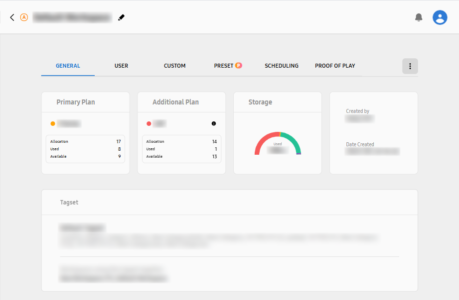 Vea la información de un espacio de trabajo, como el plan de tarifas actual, el espacio de almacenamiento utilizado, los detalles de creación, el conjunto de etiquetas y el consumo de energía.