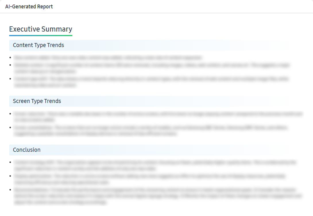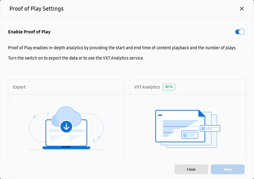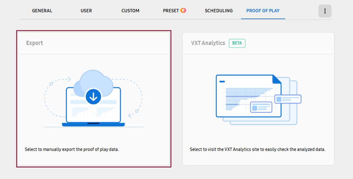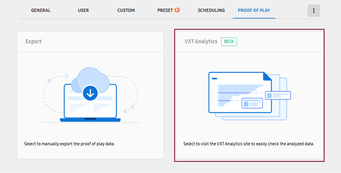 Utilice el menú VXT Analytics para acceder al sitio web de Samsung VXT Analytics. Puede ver las estadísticas del contenido y la reproducción de pantallas en los espacios de trabajo y ver los informes de IA sobre una base de datos.