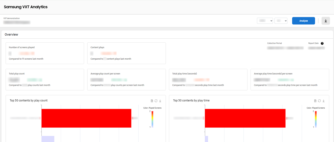 VXT CMS utiliza la función VXT Analytics para proporcionar datos relacionados con los registros de reproducción de contenidos de los espacios de trabajo y las pantallas.