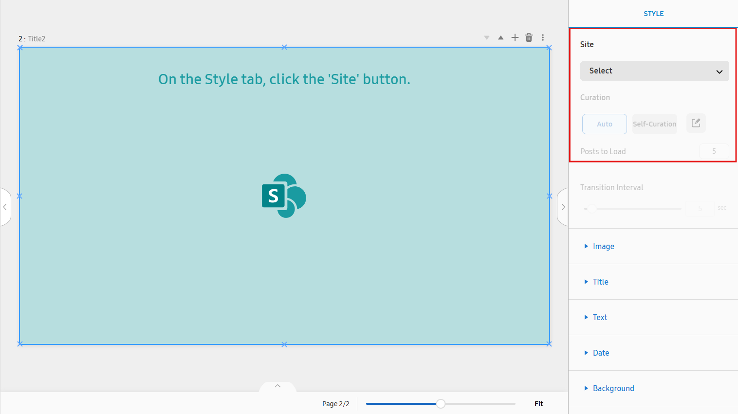 L'Intervalle de transition et les styles des composants des publications de nouvelles ne peuvent être spécifiés qu'après qu'un site SharePoint ait été sélectionné.