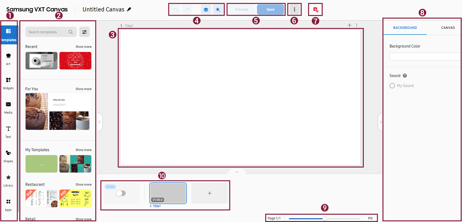 På huvudsidan för menyn Innehåll, klicka på Skapa innehåll för att öppna VXT Canvas-sidan. En namnlös duk med vit bakgrund visas.