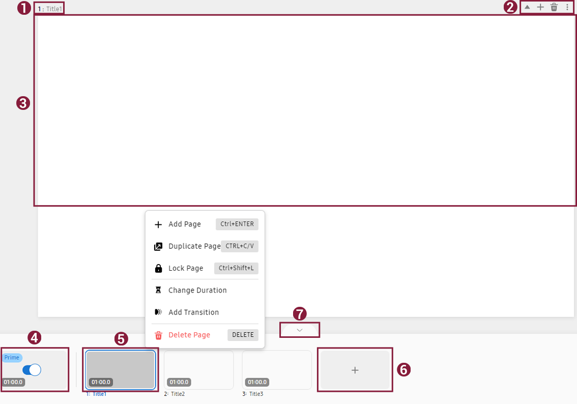 Detta avsnitt visar komponenterna i duksidans område. Om du klickar på under sidområdet visas en lista över miniatyrbilder för de sidor som för närvarande skapas.